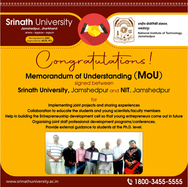 Establishment of Entrepreneurship Cell: In collaboration with NIT Jamshedpur, Srinath University has established an Entrepreneurship Cell aimed at nurturing future entrepreneurs. This initiative focuses on joint research, training programs, and conferences to enhance students’ skills and innovation capabilities .